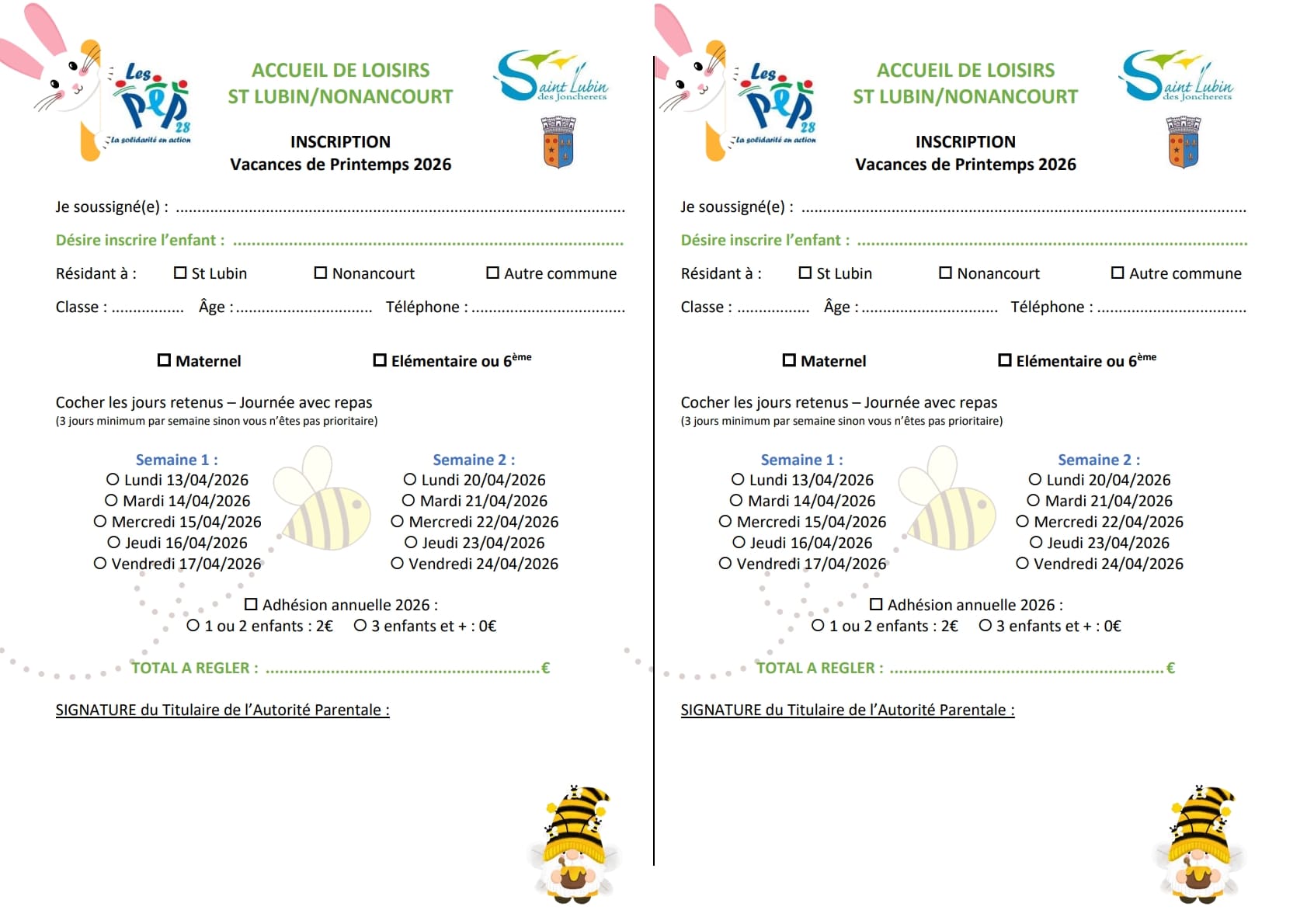 Pour rappel, les inscriptions débutent à compter du Lundi 16 mars 2026 pour les habitants de St Lubin et Nonancourt, et à compter du Mercredi 1er avril 2026 pour les « hors communes » (sous réserves de places disponibles).